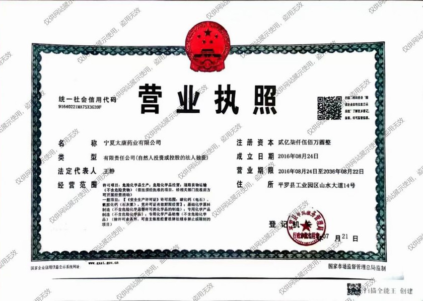 Ningxia Taikang Pharmaceutical Co., Ltd. is a wholly-owned subsidiary of Ningxia Dadi Circular Development Co., Ltd., with an area of 1,067,200 square meters, a fixed asset of CNY 674 million and a total installed capacity of 160,000 KVA. As one of the 40 large-scale industrial backbone enterprises in the Ningxia Hui Autonomous Region, our company now has more than 1,100 employees, including 134 main management personnel, 112 professional and technical personnel, 5 senior engineers, 10 engineers, 3 economists and 15 technicians. At present, our nnual production capacity: pharmaceutical intermediates- Dicyandiamide 6WT, Cyanamide 5,000T, Creatine monohydrate 3,000T, Aminoguanidine bicarbonate 3,000T; Chemical basic materials-Calcium Cyanamide 22.5WT, Calcium Carbide 12WT.