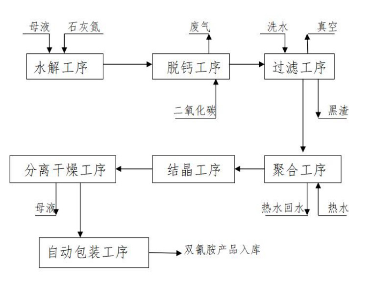 將水或母液打入攪拌罐,經(jīng)石灰氮磨細后定量均勻地加入配漿槽充分攪拌,使石灰氮完全水解,生成氰胺氰鈣液,再將水解液經(jīng)泥漿泵送入碳化塔,與來自石灰窯的經(jīng)過壓縮后進入碳化塔的二氧化碳氣體(窯氣)完全接觸反應,完成石灰氮水溶液的脫鈣過程。將水解脫鈣反應完成后的料液加入帶濾機,將石灰氮中水解碳化的雜質以及碳化過程中生成的碳酸鈣固體濾掉,得到純凈的單氰胺溶液;將單氰胺水溶液打入聚合鍋,經(jīng)蒸汽加熱至 70℃,并調整 PH 值為 10 左右,完成聚合過程,生成雙氰胺。再將雙氰胺水溶液放入抽濾桶,過濾掉聚合過程中生成的白灰等雜質,再經(jīng)硅藻土過濾機過濾得到純凈的雙氰胺溶液;將純凈的雙氰胺溶液打入結晶鍋,通過冷凍站來的低溫水雙氰胺水溶液進行降溫、結晶,在溶液中析出雙氰胺固體;將結晶鍋中的溶液放出,經(jīng)抽濾桶過濾,其中雙氰胺晶體經(jīng)離心機甩干,再經(jīng)流化床干燥機干燥,得到雙氰胺成品;將濾掉的雙氰胺母液送入配漿槽作為石灰氮水解用,完成工藝系統(tǒng)的密閉循環(huán)。